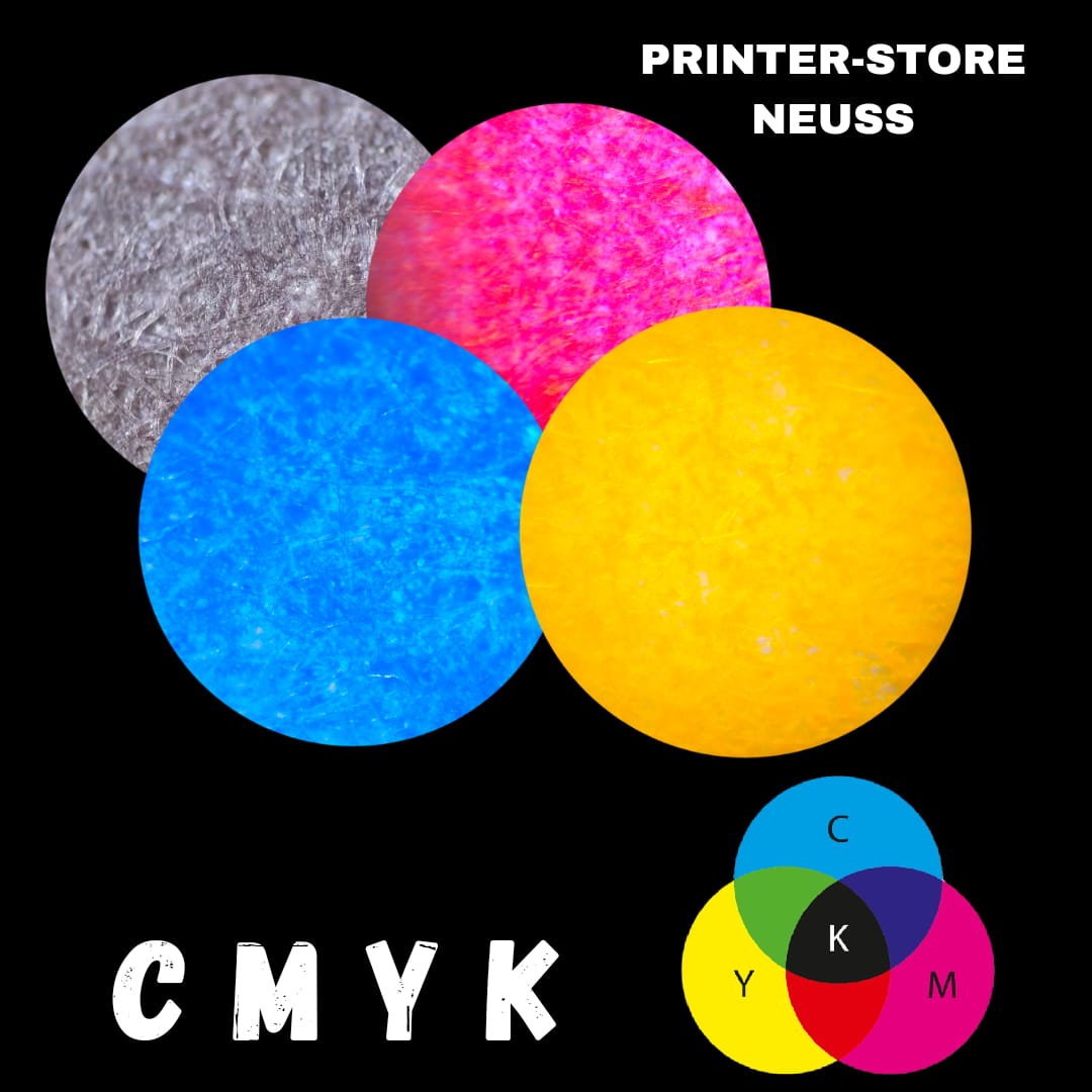 Die Abkürzung CMYK steht für die drei Farbbestandteile Cyan, Magenta und Yellow sowie Key (Black) als Schwarzanteil. Key (Black) ermöglicht eine tiefere Schwarzdarstellung, die sich nicht einfach durch Mischung der anderen drei Farben erzielen lässt. Je nach Mischungsverhältnis lassen sich aus diesen vier Farben über 16 Millionen verschiedene Farbtöne darstellen. Ein normaler Drucker kann jedoch in der Regel nur ca. 16.000 Farben darstellen, was für hochwertige Fotoausdrucke meist ausreichend ist. Um den Farbraum zu erweitern und eine noch größere Farbpalette zu erzielen, nutzen einige Fotodrucker zusätzlich weitere Farben, wie z.B.: