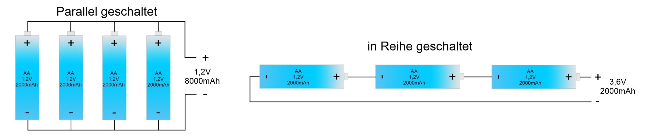 Bei der Parallelschaltung addieren sich die Kapazitäten (mAh) und die Spannung bleibt gleich. Mit jeder weiteren parallel geschalteten Zelle verlängert sich die Laufzeit des Akkupacks.